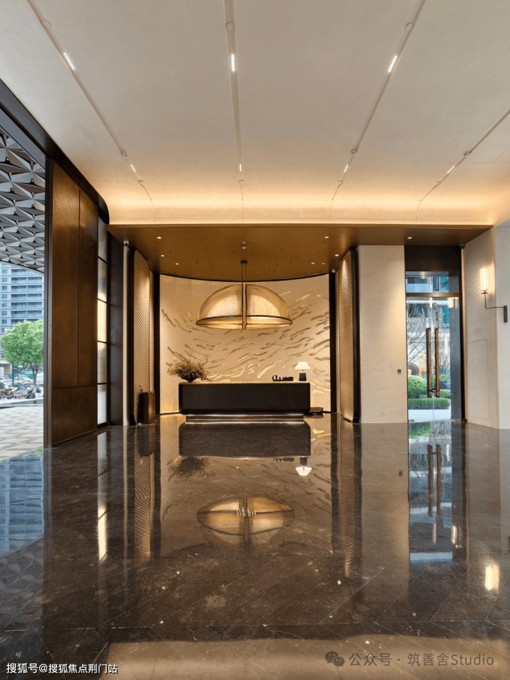 御潮印的门头是板块内最大的,宽达60米,高约6.8米,很大气的。价值百万的迎客松,搭配3.4米高的云石灯,铺陈进口孔雀玉、贝金米黄等奢石,与奥映鸣翠同款石材相得益彰。香槟色龙鳞铝板吊顶,千片龙鳞精密排布,更显恢宏气度。