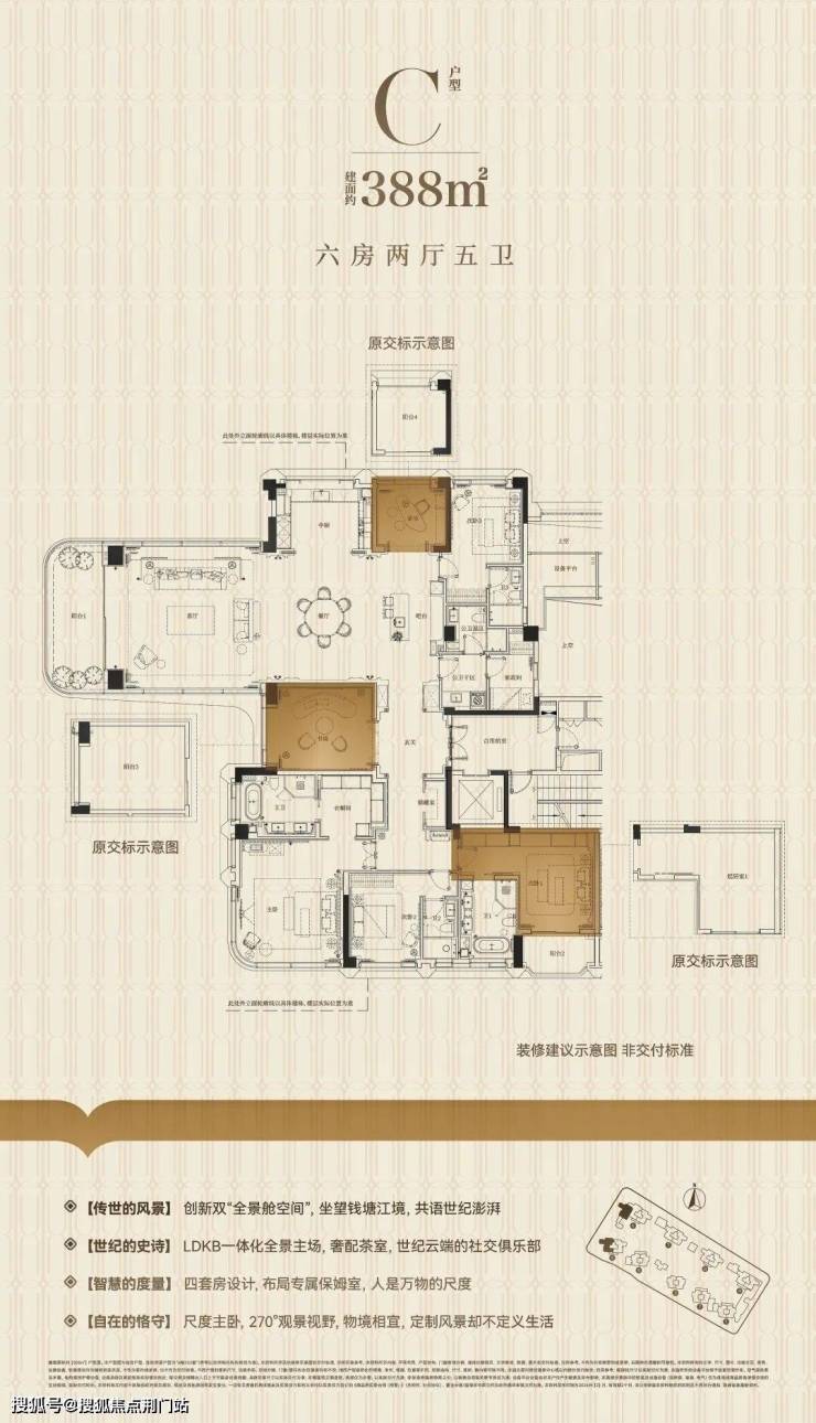 户型特点:约107方餐客厅,46.4方主卧,我只能说“壕”,388方做到了商业大平层的面积,得房率90%又是商业大平层绝无仅有的,6房4套房,长辈二胎都考虑在内,270观景视野。