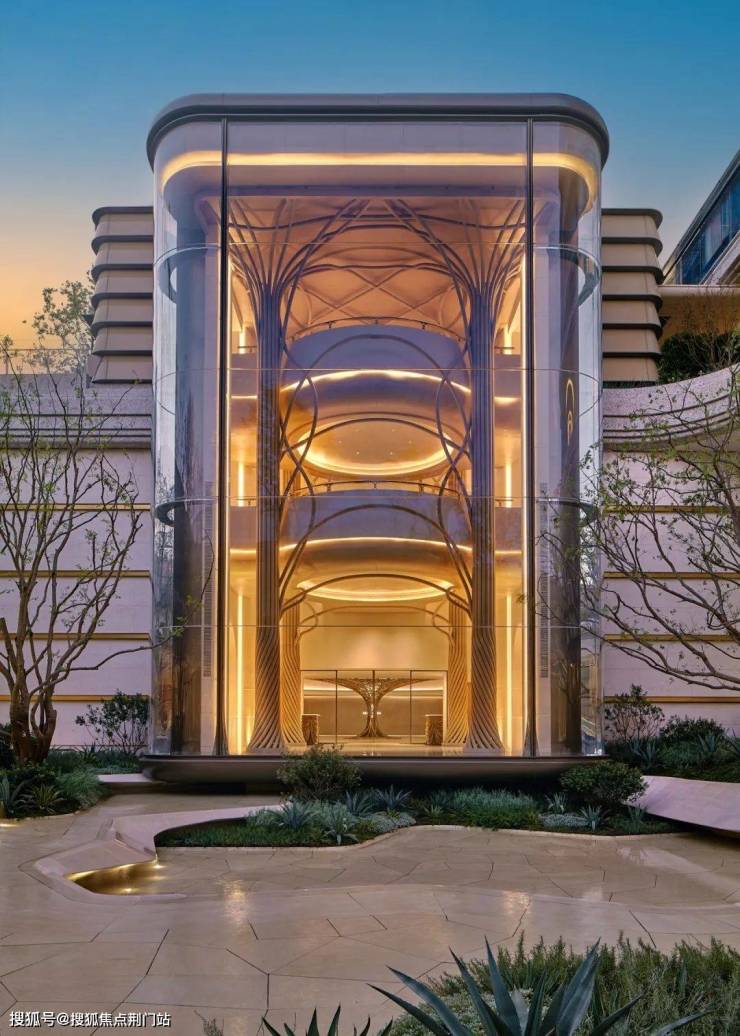 大门内外两重门厅景墙运用月光米黄石材近1000 方,搭配香槟金金属线条,汲取爱马仕全球旗舰店的双曲面叠墙造景手法,增加景墙奢华质感。 项目沿河的楼幢整体上抬,也就是——抬地式。好处在于地库通风,客户行车归家动线更合理。