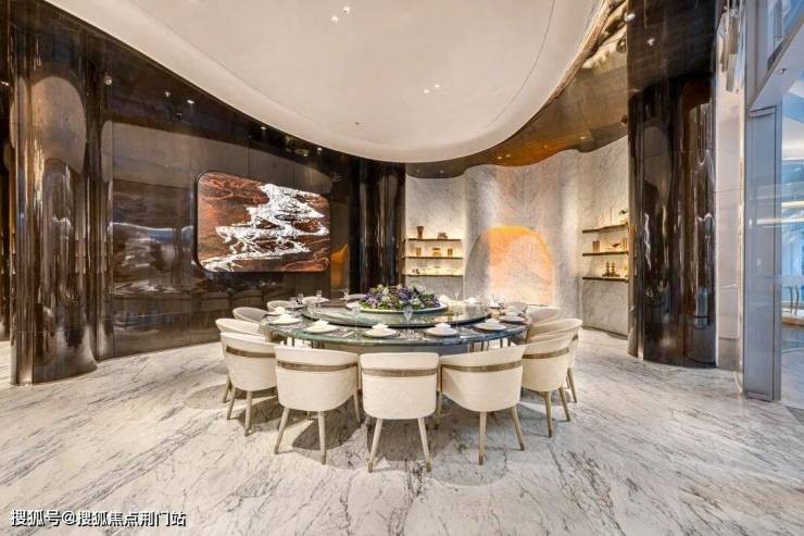 不止于此,元序居然花费重金做到奢石满配:中央车马厅层墙面局部采用雪花白奢石,池壁为巴西利亚黑奢石,池底铺进口黑金砂,溢水台面选用“绿野仙踪”奢石,大堂月光米黄石材,有些地面铺上了太古黑金石材,蓝水晶石材背景墙…