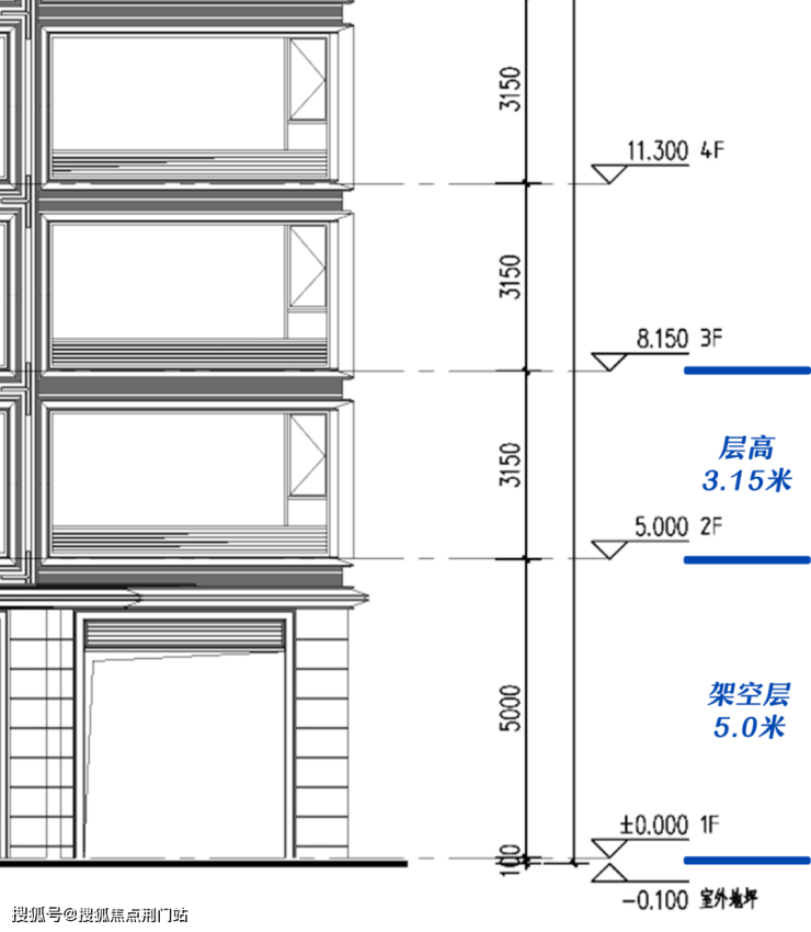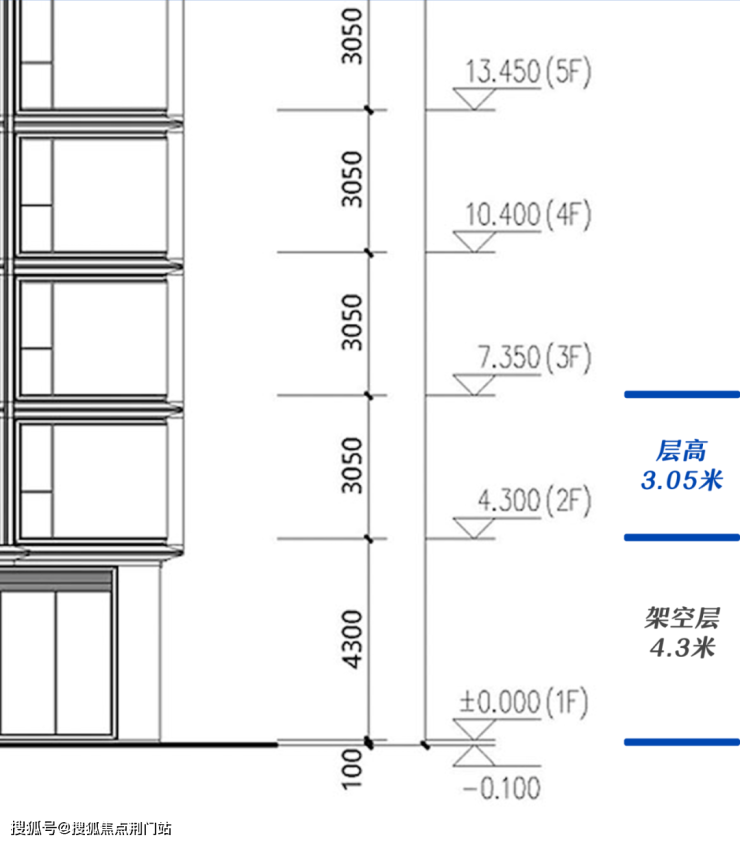 项目高层架空层4.3米,住宅层高3.05米,沿北侧西园九路的小区人行出入口处,设置景观构架和下沉庭院。