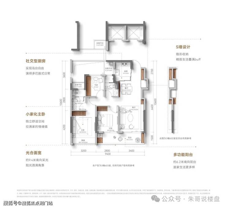 亮点:约9.4米南向采光面;约6.2米南向多功能阳台;社交型厨房可实现岛台自由;S墙设计极致收纳。