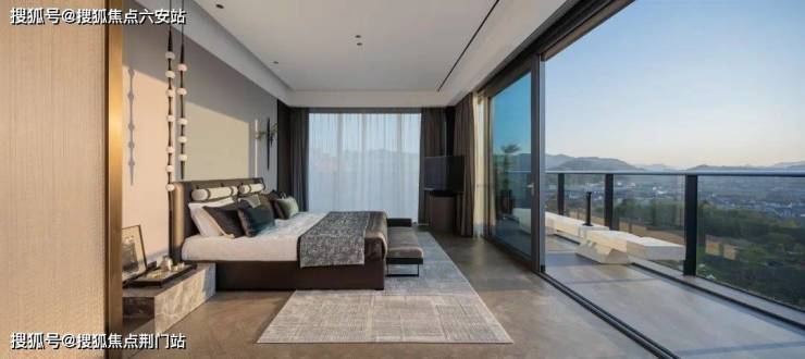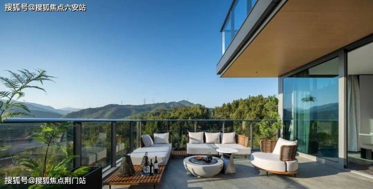 [玻璃山房]南向,以 大面积落地玻璃窗,将风景迎入室内,经由充分的通透感拉近人与自然的距离;迈出房间,便为 270°“环景大露台”,既拥有高度秘密性设计,还能将生活沉浸在群山环抱中,感受对饮湖山的豪情。