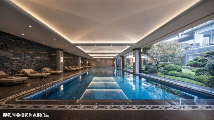 从恒温泳池的落地窗往外看这些树,就像是一个个精致的“巨型盆栽”。