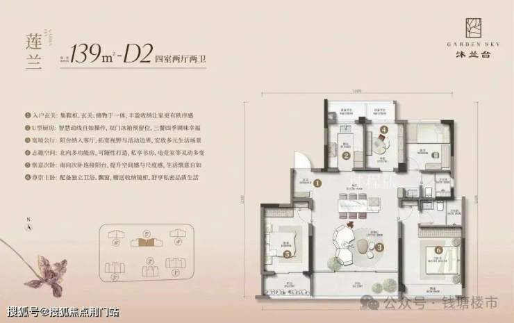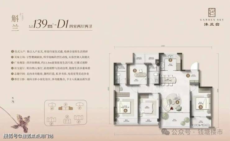 建面约139方四开间朝南的D1户型,双阳台、双飘窗赠送面积多,还能能看到南向度假风泳池。