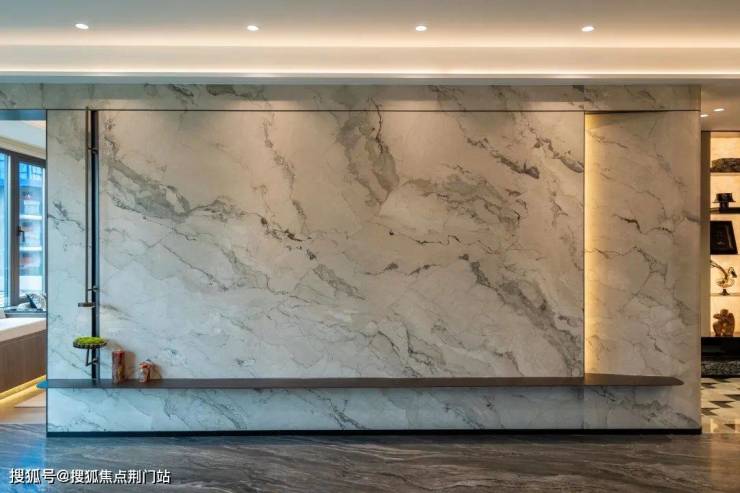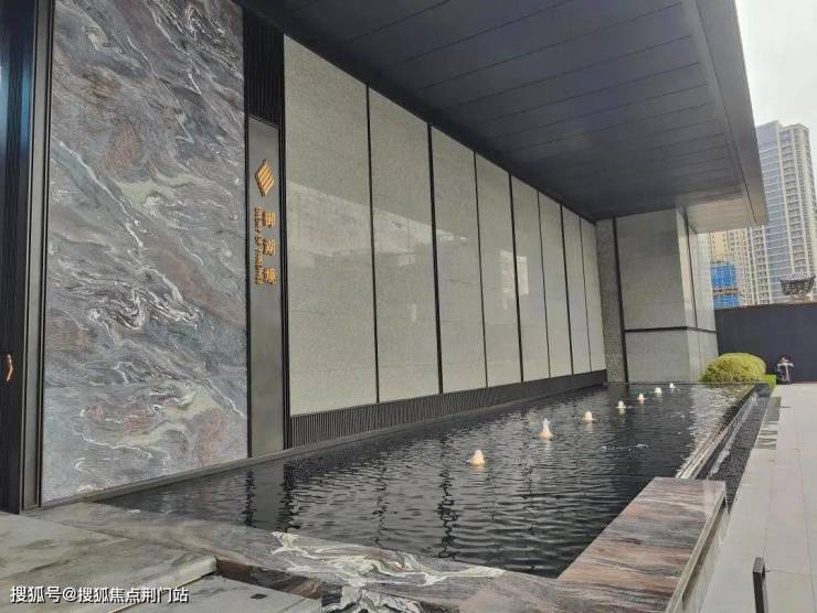 比如这个长约63米、高约8米的山水门庭,采用全石材幕墙,搭配八面来自伊朗的巨幅蓝眼睛奢石屏扇、意大利进口的千年紫山水,气质恢弘,堪比星级酒店门头。