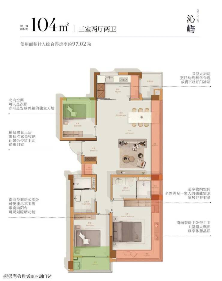 大量赠送面积的拓展,使其拥有约97.44%的超高得房率,堪比市场面主流约150㎡+户型的实用空间。