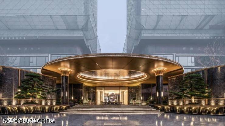 最具仪式感的应该是大门入口处:宽约35米、高约6.5米的寰宇云厅,如殿堂一般气势恢宏,两侧还有挪威蓝翡翠石材景墙对仗而立。
