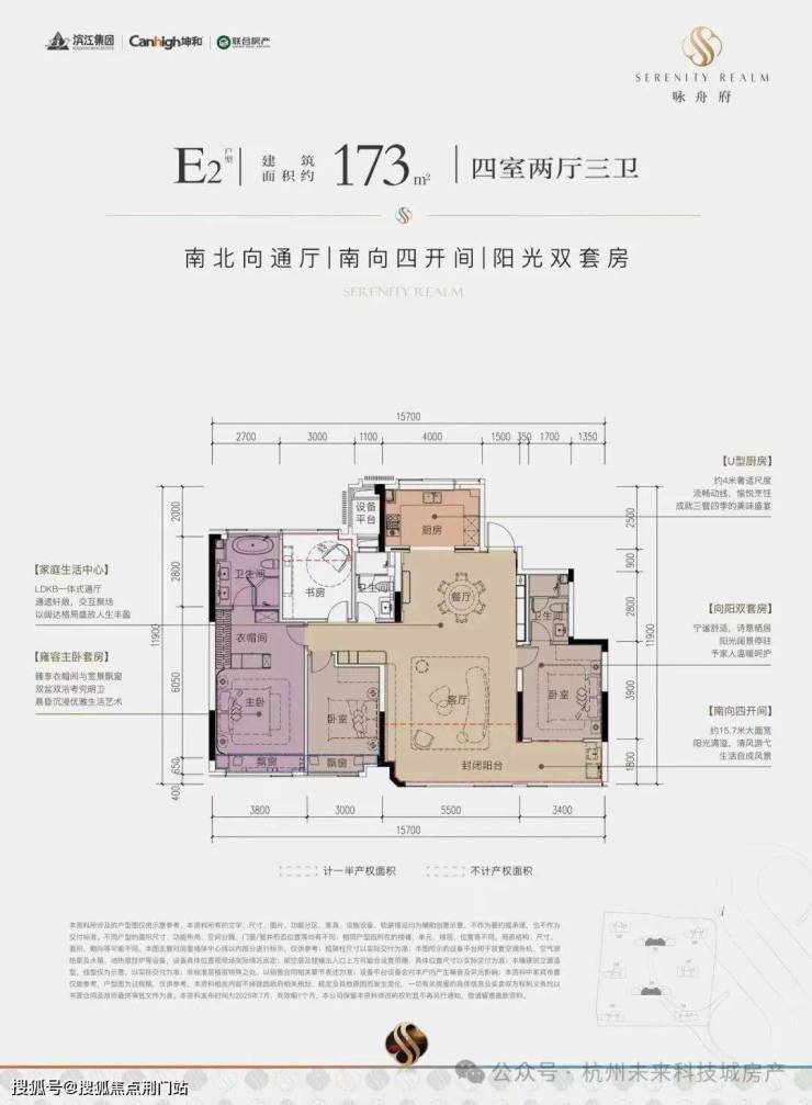:约123㎡三房两卫起,173㎡终极改善户型,匹配精英家庭生活场景。