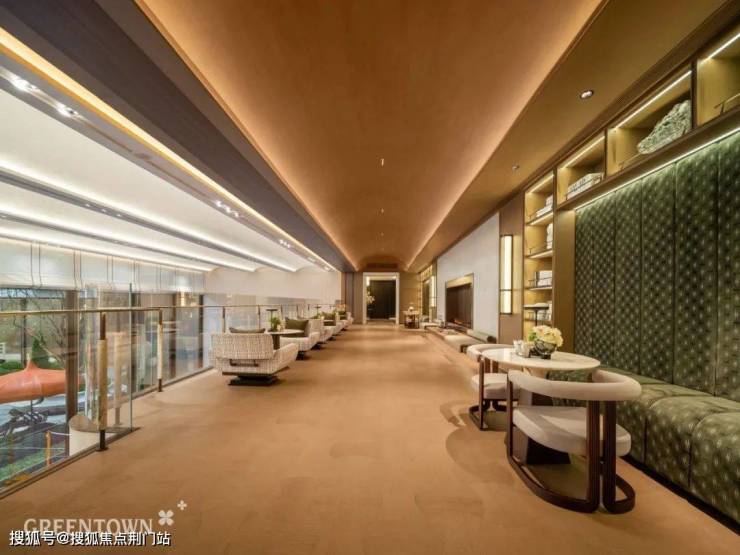 宽幅叠瀑水景,搭配汉白玉奢石海棠雕塑,水流潺潺、光影交织。约7米高宝格丽绿奢石景墙,维纳灰石材为框,玻利维亚黑奢石嵌入“点睛”……且行且赏,每一眼皆怦然心动。
