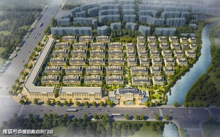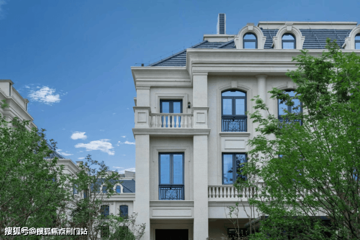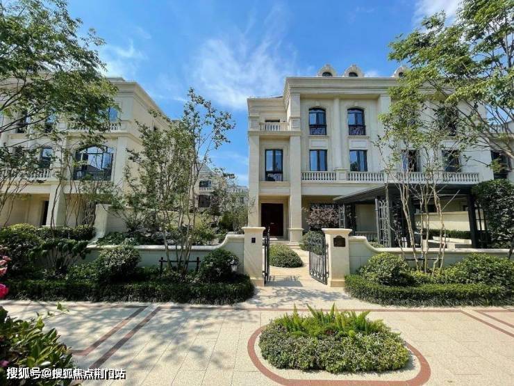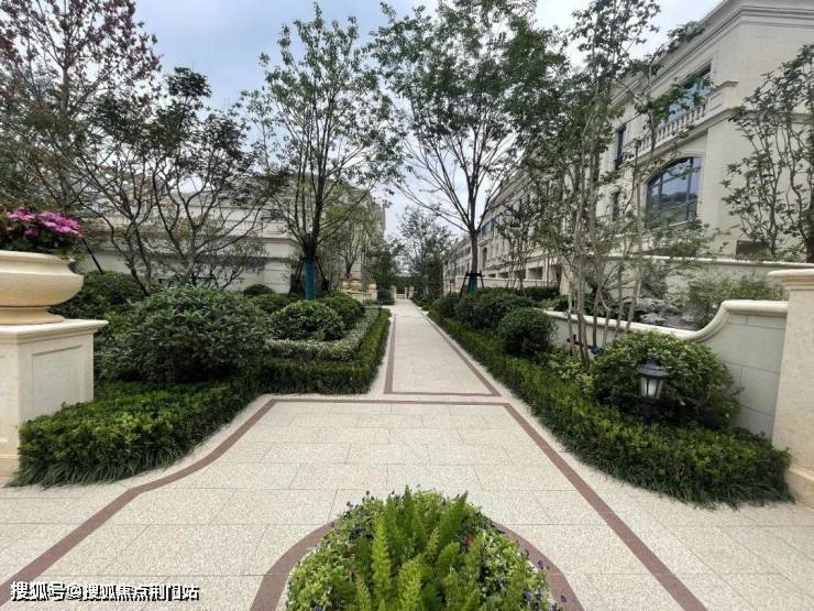 整个园区,以经典的绿城法式墅区景观大中轴贯穿,占地约1000多㎡,联排建筑的设计,融合了中国传统院落布局与法国枫丹白露宫的审美,外立面大面积采用全石材干挂,檐口等细节部位使用仿石。