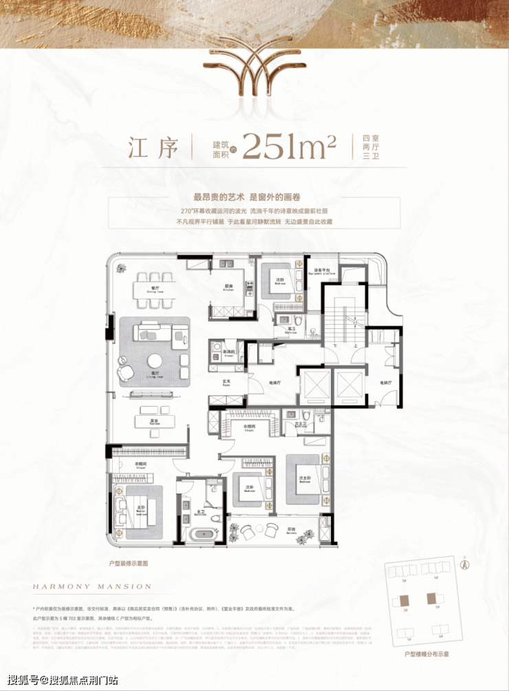至于建面约355方,双电梯入户,至高规格。以电梯厅为轴,一分为二,左动区,右静区,泾渭分明,互不干扰。至于南向约27米全面屏,双露台加持,任日月星辰洒落。