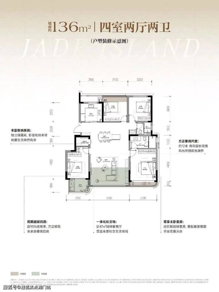 位居社区楼王位置。4个房间里,有3个都是套房,其中南向双套房。试想一下那个场景,男女主人在大卧室起居、晨起洗漱,远看美景。家里老人在次套房也有很好的居住体验,起夜不用离开自己的卧室,非常方便。