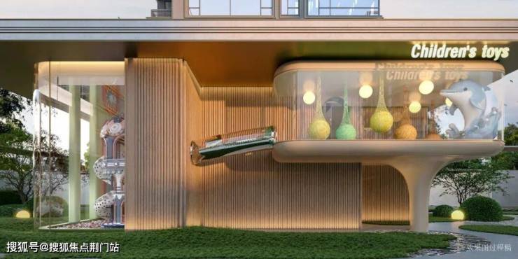 相比同系作品,沐芳洲在此理念上进一步迭代。在这个多维架空空间里,规划了高差近10米约740㎡的下沉庭院、约1600㎡的室内恒温泳池、健身房等会所,并设置了层高约7.2米的童玩空间、阶梯书吧等多功能场所。