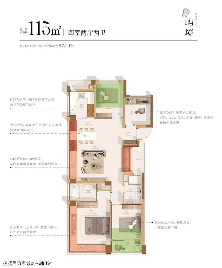 大量赠送面积的拓展,使其拥有约97.44%的超高得房率,堪比市场面主流约150㎡+户型的实用空间。