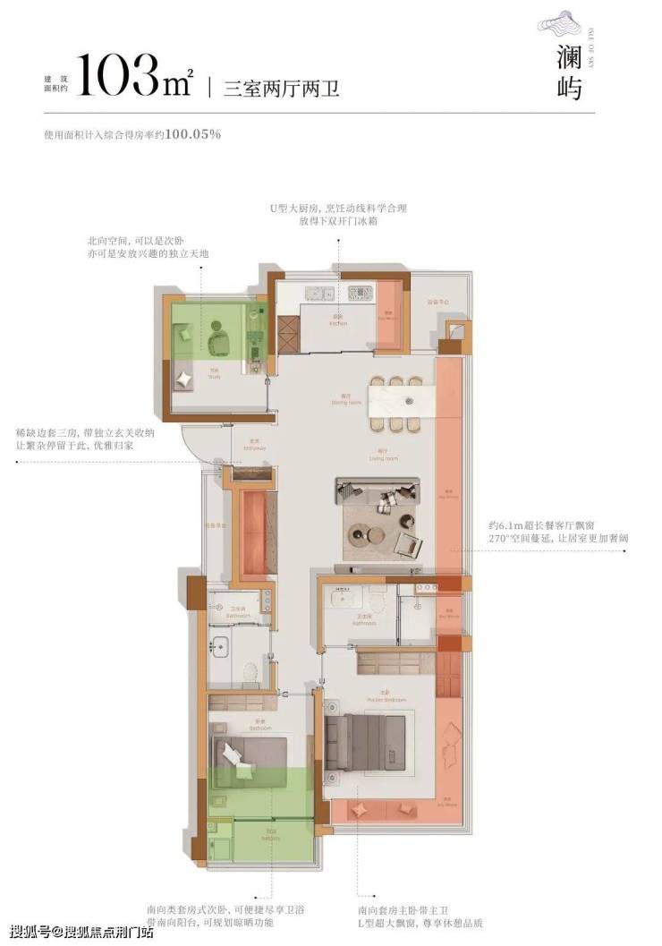 以沐芳洲建面约103㎡户型为例,赠送面积超过了25.5㎡,仅飘窗赠送面积就有约13.9㎡,实际使用得房率高达100.05%!