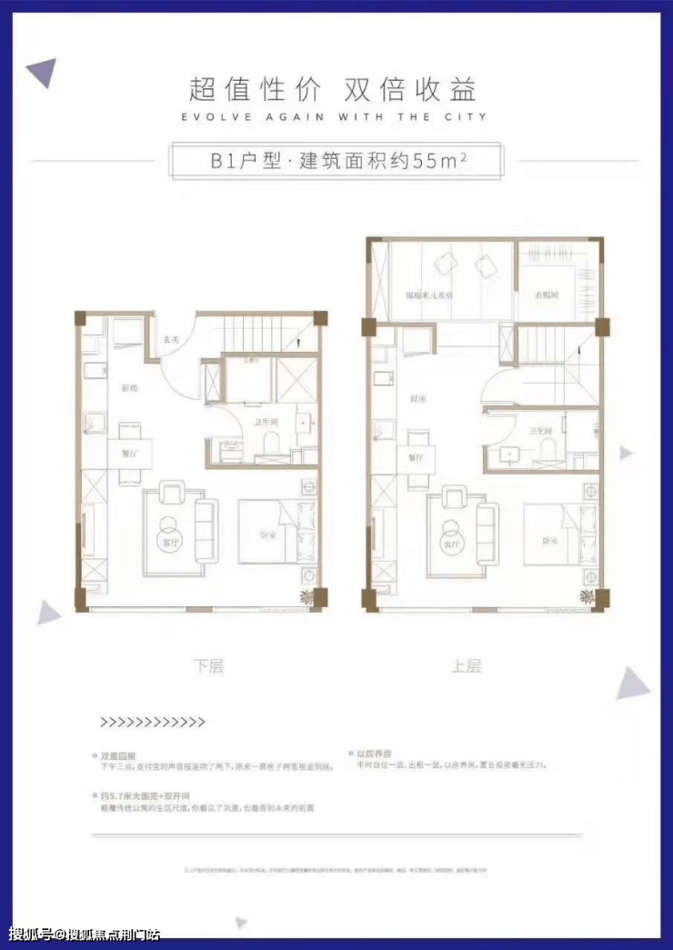 65方loft户型,三室两厅一厨两卫,户型方正,开间约7.2米的超大采光面,楼下卧室客厅,两开间朝南,一楼卫生间并配有淋浴间。
