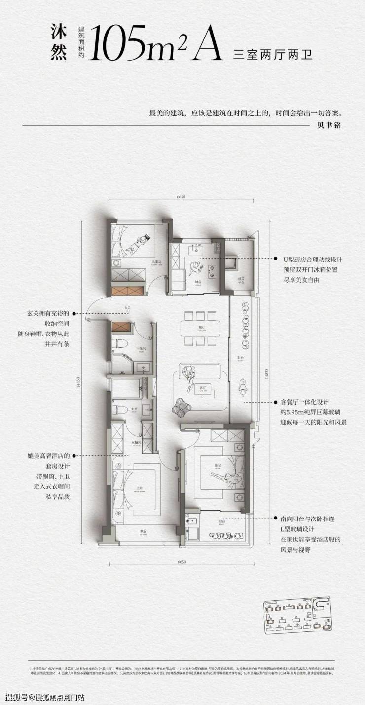建面约105m²的户型有近6m的纯屏巨幅玻璃,大大提升了采光和观景的需求,“起床就能看到风景”。约5.95m大尺寸的横厅连接超长阳台,做出了奢阔的空间感,形成全家人欢聚的超级大公区。媲美高奢酒店的套房主卧带走入式衣帽间、主卫和飘窗,南次卧带阳台,还是L型玻璃护栏设计,尺度感非常阔绰。