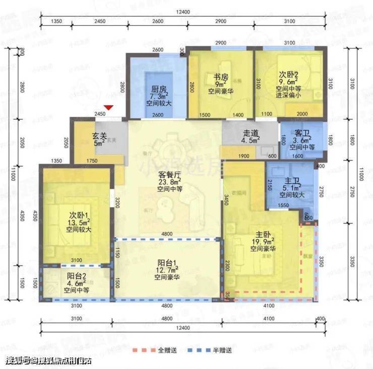 ❶建筑面积约120㎡户型,4房2厅2卫,含赠送得房率约88%。