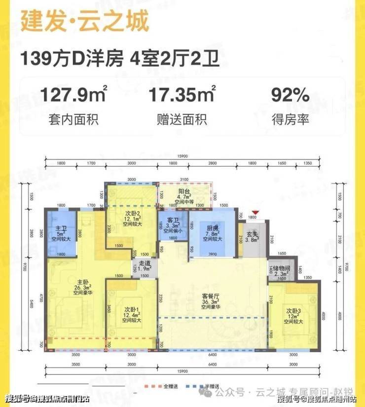 云之城做了封闭阳台,得房率最高能达到96%。全T2分布户型,放眼整个市场,这样的得房率绝对是名列前茅。