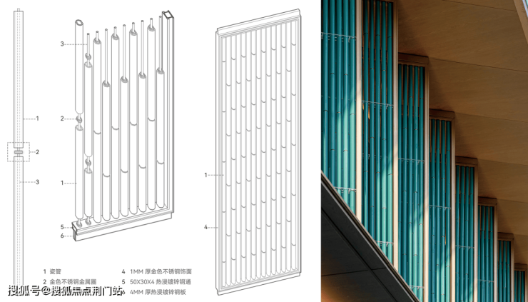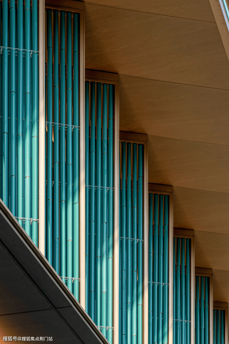 青绿色瓷管经过多轮选材,最大程度保留青瓷的典雅质感,确保在自然光线下呈现温润的意境。金色型材作为点缀,镶嵌于建筑细节中,也增添了视觉层次和精致度。