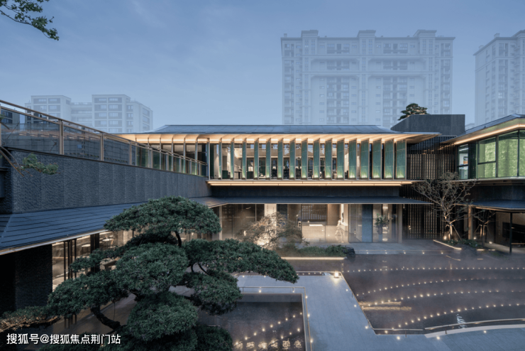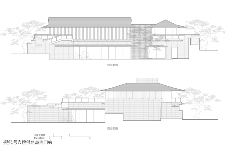 在公区入口,建筑师提取画中的山石、流水、楼阁、青松等元素意象,将之分别转译为建筑的基座、立面、屋面、景观小品等空间要素。“以筑为画”——以建筑的空间要素来重新绘就一幅“可实景体验的山水画”,并借助曲径通幽的动线设计进一步引人入画。在路径视角、环境感知的变化中,实现了画意与空间的第一步转换。