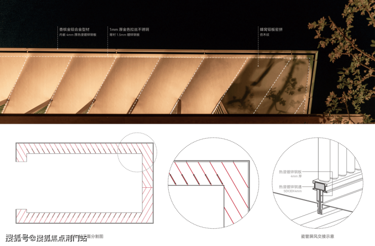 “瓷”是宋代代表性材料之一,近年来也逐渐被应用于建筑和室内营造中。我们将其运用在建筑立面的屏扇处,大尺寸版幅由多条工业化瓷管拼接而成,呈现格栅样式,并按照铝板的斜向划分进行安装。