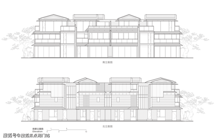 屋面处理是中式及“宋风”建筑中最为关键的要素。有别于其他广泛沿用传统歇山顶或悬山顶的南方民居做法,我们在设计中结合现代住宅的遮阳挡雨需求,采用了双坡屋顶与金属格栅相结合的屋面系统。依据住宅单体的形态布局及综合关系,屋面将呈现不同朝向,从而从建筑群象的视角勾勒出鳞次栉比的传统民居聚落意象。