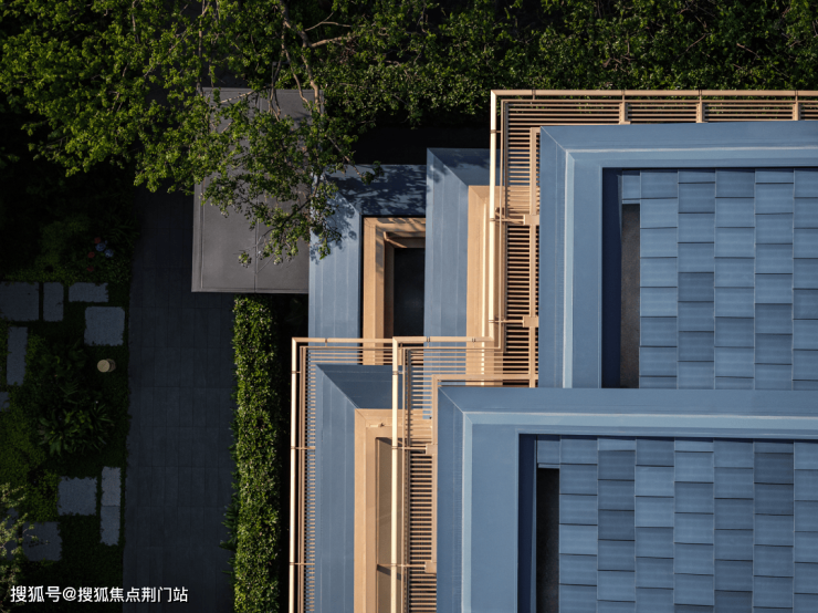 蓝色琉璃“瓦”的设计则源自宋画中的官式建筑。高光泽度的蓝色屋面光滑剔透,从高空俯瞰,靛蓝色瓦片铺展在建筑群间,勾勒出独具宋画意韵的现代居住群落景象。