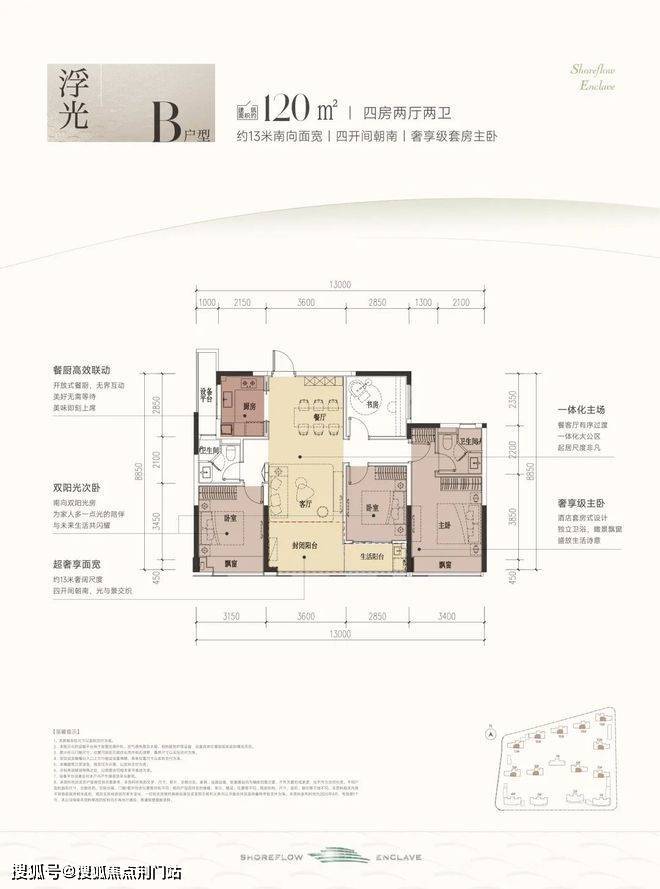 这款户型堪称四开间朝南的“流量王者”,南向面宽约13米,双联阳台+双飘窗设计,视野和采光优秀;套房主卧、双阳光次卧,颇有大平层的气势。