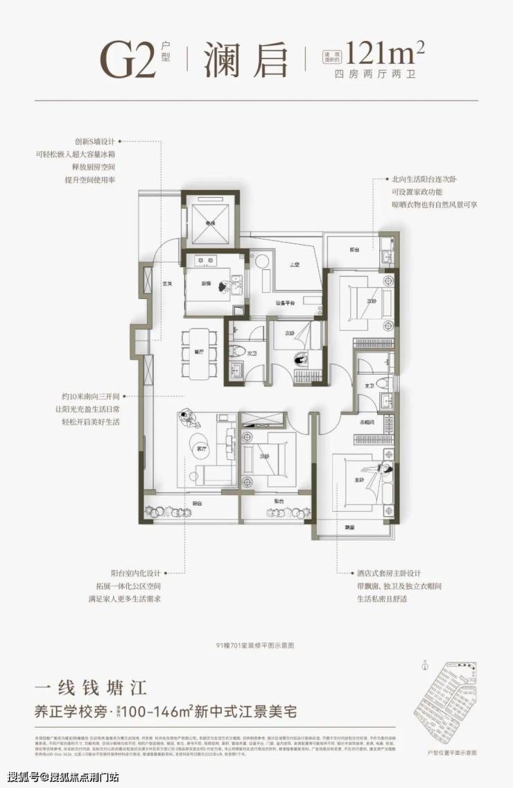 建面约146㎡则分为横竖两款,全部一线朝江。两梯两户,都有独立电梯厅。“横版”是四开间朝南+大方厅,“竖版”有大边厅+超长转角飘窗的“全景舱主卧”。