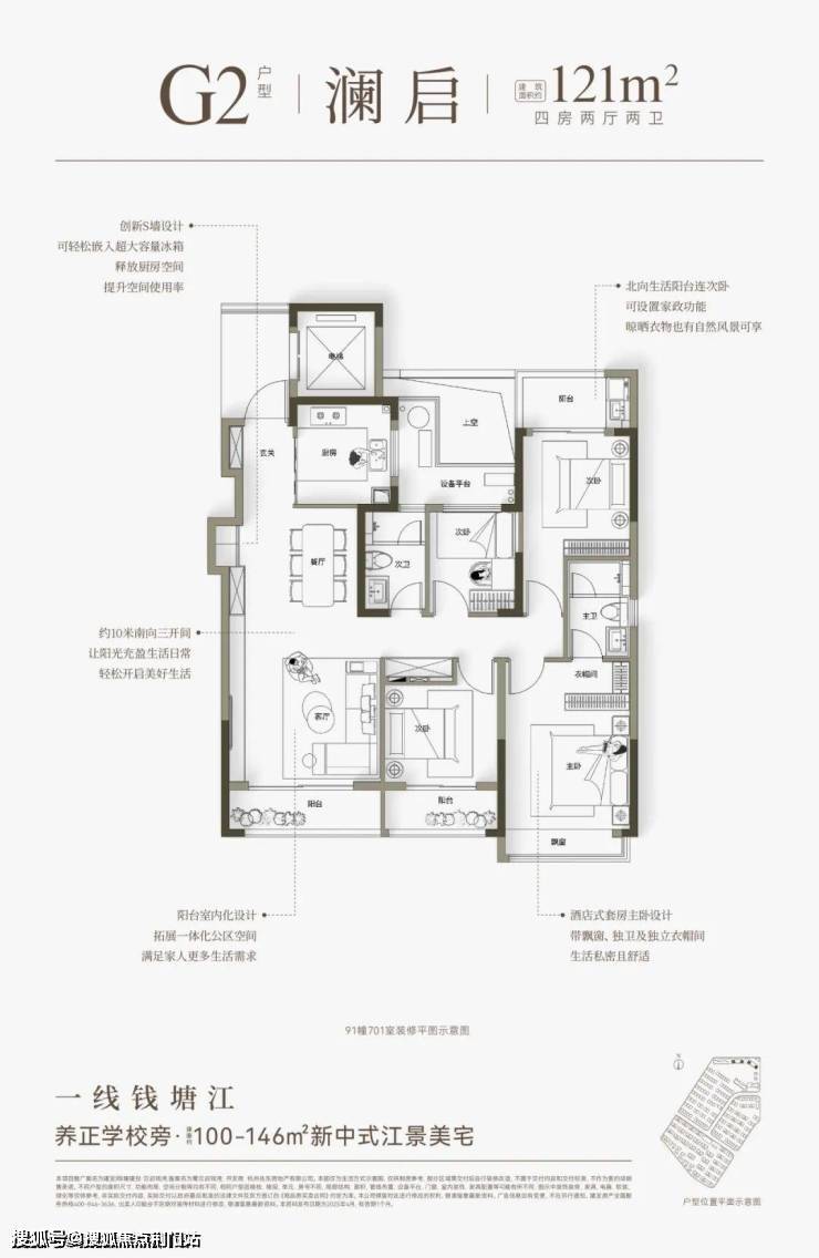 建面约146㎡则分为横竖两款,全部一线朝江。两梯两户,都有独立电梯厅。“横版”是四开间朝南+大方厅,“竖版”有大边厅+超长转角飘窗的“全景舱主卧”。