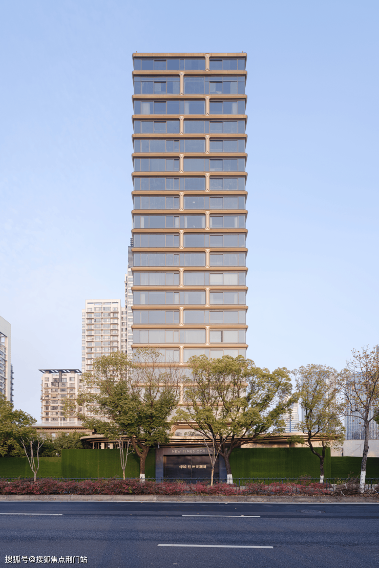 设计提取钱塘江水“潮涌”的动态元素,抽象为独特精美的金色铝板曲面线条,结合大面积的玻璃,勾勒建筑体量的层间关系,交织出极富韵律的纵向线条,以潮水般流动变化的独特气质屹立江岸,又融入钱塘潮水流淌奔涌的历史之中。