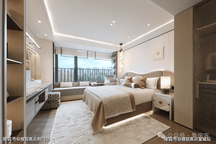 在春来晴翠园 建面约169㎡晴翠户型中,最亮眼的设计显而易见—— 主卧90°转角窗,揽获270°环幕视野,将天光云影尽纳室内。不仅引入绝佳采光与风景,更成为一处心灵栖所。