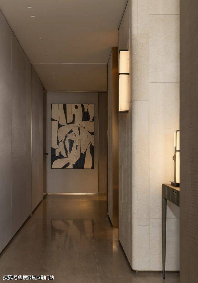 内外双重门厅景墙运用了约1000方顶奢才会用上的月光米黄石材,还是更费料的弧形石材,搭配香槟金线条,与爱马仕全球旗舰店的双曲面叠墙造景手法如出一辙。
