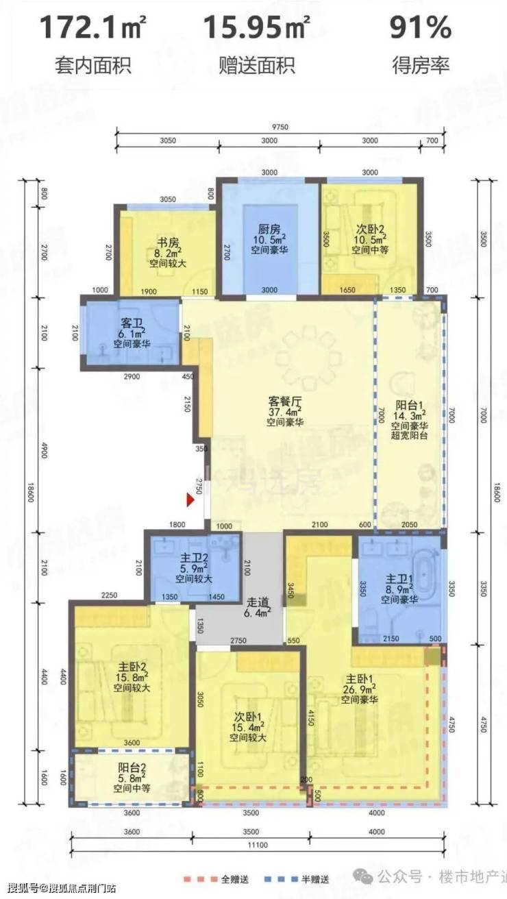 1)139方边套户型,4房2厅2卫,得房率87%