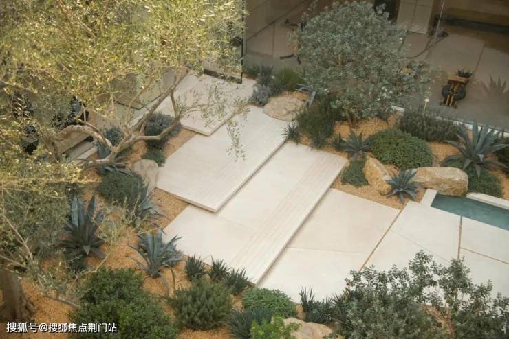 漂浮的海角花园自由延展,砾石花园与林台错落交融,树影与水光相映成趣。米白墙垣与古铜铝板的肌理在光影中呼吸,植物舒展的枝桠以舞蹈的姿态定格成永恒油画。