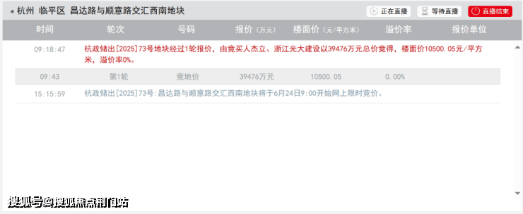 东湖新城单元LP111204-02地块过1轮报价,由竞买人杰立、浙江光大建设以32147万元总价竞得,楼面价10500.07元/平方米,溢价率0%。