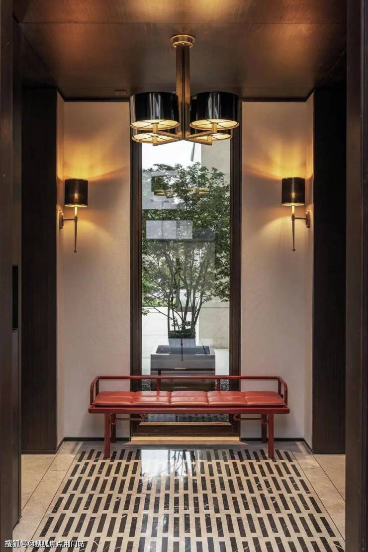这套户型的玄关,用一面竖向的玻璃,向庭院借景,一张亮色的皮质长椅,挨窗而放。