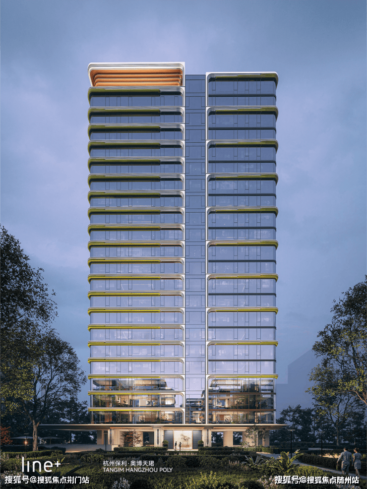 保利·奥博天珺的建筑外立面,依然是非常杭州的表达。镶嵌在繁复线条中的绿色陶板,用造价昂贵的曲线,刻画出了龙井春芽的神韵。
