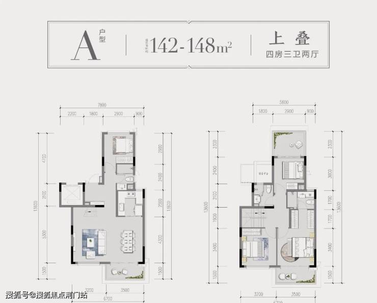 但如果让我选,我可能会更喜欢上叠,基本格局与下叠类似,但上叠的 三个阳台和使用面积约60多平的露台太难以让人拒绝。