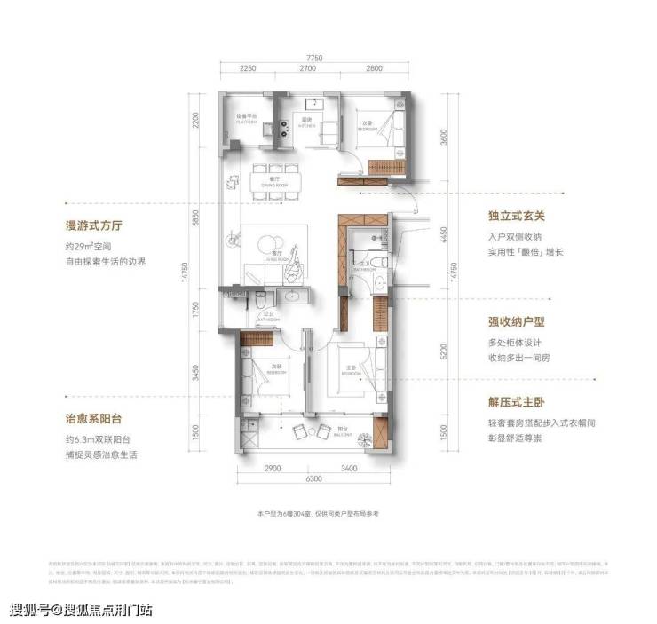 户型方正,没什么浪费面积,虽然是中间套设计,但做到了全明户型,通风效果好;南向三开间,双联阳台+飘窗,南向采光充足,阳光满堂;超配S墙,隐藏收纳柜,让小家越住越大,可以说杭州少见。