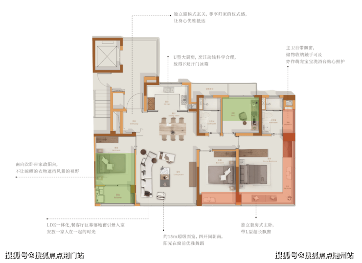 U型厨房与餐厅相连,轻松容下双开门冰箱;主卧独立套房,媲美豪宅的270°转角大飘窗设计,坐拥无敌视野。