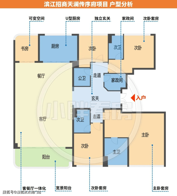 整体客餐厅南北通透,带有家政间,光从户型图来看入户无独立玄关,两梯两户的情况下,其实也可以把鞋柜等做到门口,或者视客餐厅尺度而定打造玄关柜。