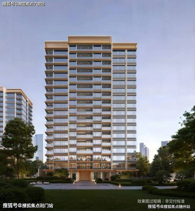 潮映杭园的建筑外立面采用铝板搭配大面玻璃和金色格栅顶冠,公建化立面设计展现出现代简约的美学风格。外立面材质选择上,项目选用玻璃、金属板材和石材,拒绝使用涂料或面砖,保证了立面的持久如新。