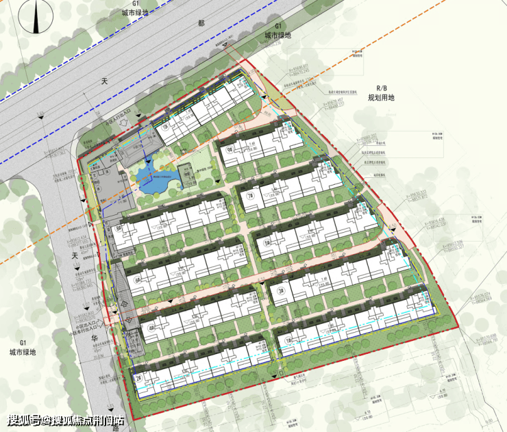 3、建筑外立面材料以干挂石材或玻璃幕墙或金属板材为主,不得采用涂料、真石漆、面砖等材质。注意与周边城市景观界面的通透性,沿天都路一侧的住宅建筑面宽不得大于55米。