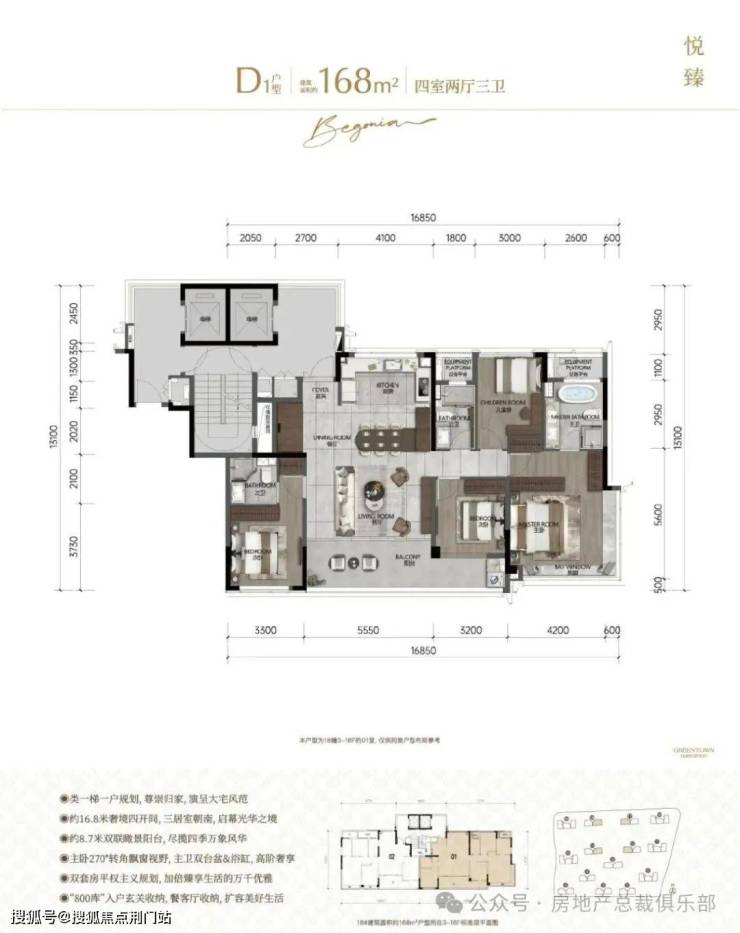 168㎡D1户型·四房两厅三卫,尊享一梯一户归家礼序,创新设计引入光之宴会厅南北双向对流,四开间朝南,面宽扩展至约16.8米,格局方正雅致,配备充足收纳空间,主卧配备270°全景视野,尽享景观盛宴。