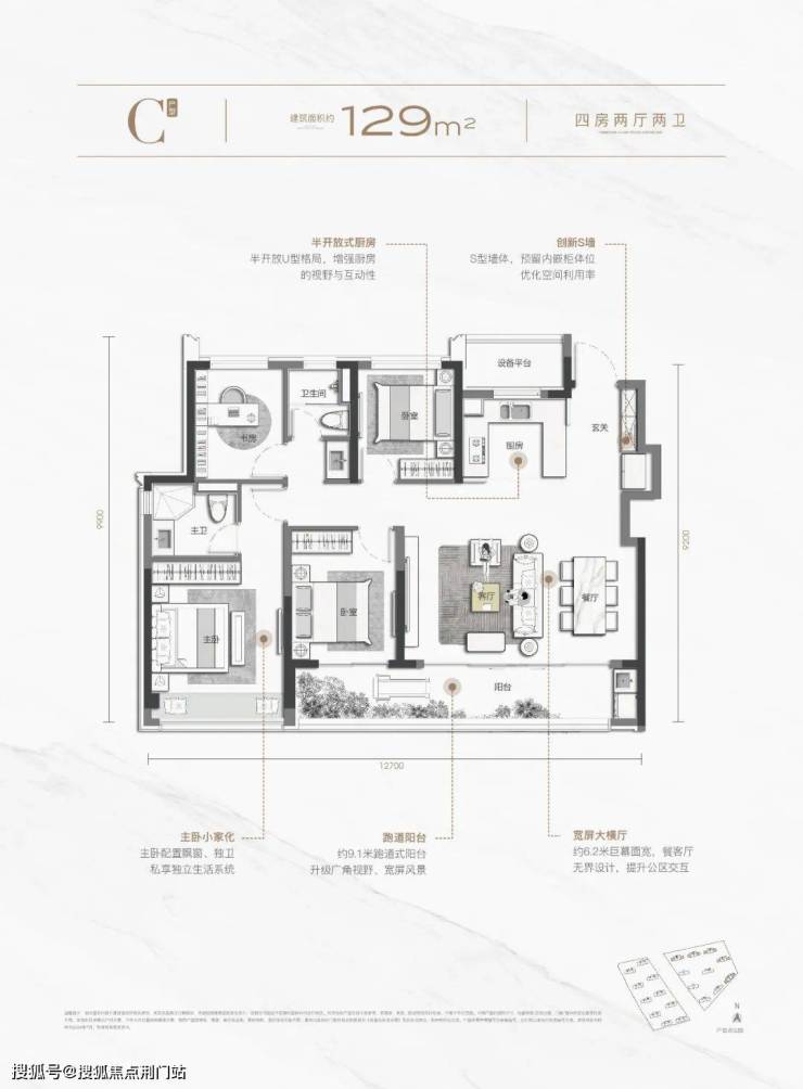 而129更是均衡到位,户户边套格局,全明通透,配合约12.7m四开间面宽、约9.1m三开间跑道式阳台,时刻感受阳光与风景的照拂,半开放式厨房,通过L型玻璃移门开合,打开提升情感的交互,关闭则可轻松隔绝油烟。