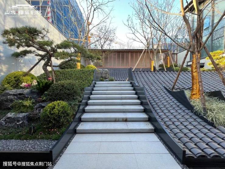 如果你去项目实地看下,一定会被入口界面攥住眼球。迎面而来的就是一大块的琉璃景墙,档次拉满,拾级而上,到处是屋瓦铺陈的漂亮景观,绿植穿插其间,主打一个“归家即度假”的松弛氛围感。