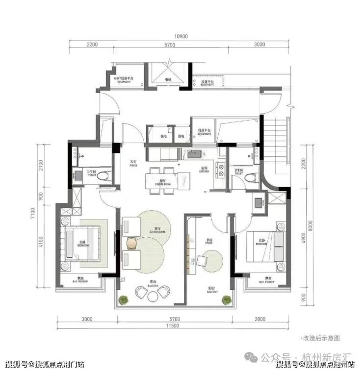 刚改旗舰边套户型:建面约114方四房两卫。